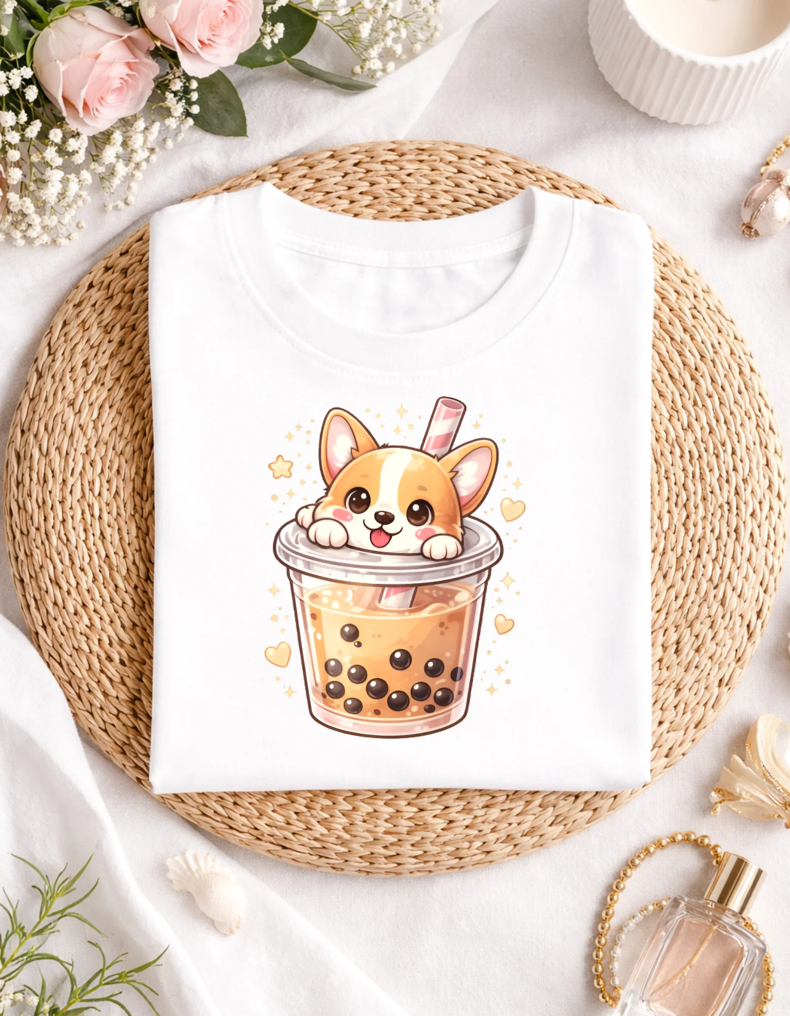 Corgi in a Bubble Tea Cup T-Shirt for Animal Lovers – Cute Dog Mom Gift Idea, Kawaii Boba Tee for Women Men, DTF Transfer Available